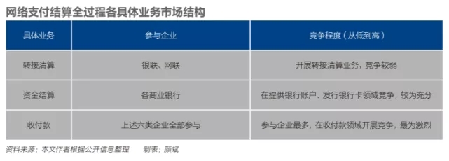 (二)網(wǎng)絡(luò)支付市場(chǎng)的六類企業(yè)、市場(chǎng)結(jié)構(gòu)及競(jìng)爭(zhēng)格局