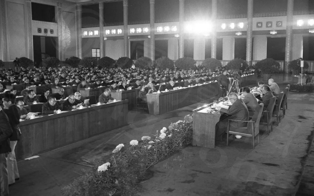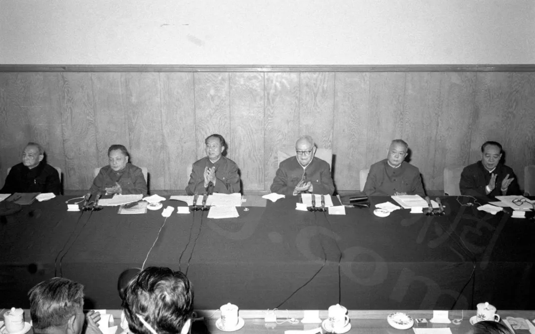1978年12月18日至22日,中共十一屆三中全會(huì)在北京召開。陳云、鄧小平、華國鋒、葉劍英、李先念、汪東興(自左至右)在十一屆三中全會(huì)上