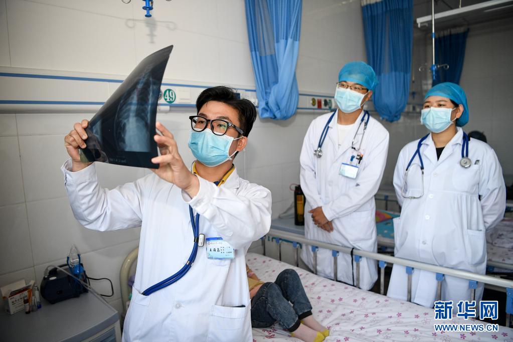 來自福建省泉州市第一醫(yī)院的醫(yī)生王海島(左一)與寧夏同心縣人民醫(yī)院醫(yī)生交流患者病情(2020年9月18日攝)。新華社記者 王鵬 攝