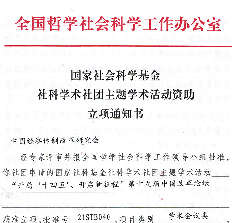 根據(jù)全國哲學(xué)社會(huì)科學(xué)工作辦公室發(fā)布的“2021年國家社科基金社科學(xué)術(shù)社團(tuán)主題學(xué)術(shù)活動(dòng)資助名單” ,我會(huì)以 “開局‘十四五’、開啟新征程”為主題的第十九屆中國改革論壇獲得國家社科基金立項(xiàng)資助。這是繼今年3月份我會(huì)《推進(jìn)土地、勞動(dòng)力、資本、技術(shù)、數(shù)據(jù)等要素市場化改革研究》課題獲得國家社科基金重大項(xiàng)目立項(xiàng)后,兩年內(nèi)第四次獲得國家社科基金資助(獎(jiǎng)勵(lì))。