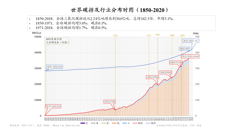 另外,我有兩張圖跟大家分享一下,也是和這個題目相關(guān)的。這張圖上面藍(lán)線是對我們環(huán)境長期的一個觀測,二氧化碳濃度水平。在夏威夷的莫納羅亞島,從1958年開始有持續(xù)性的觀測,在此之前通過南極冰雪的資料,可以一直追溯到1850年(285PPM)。很有意思1851年全世界第一次工業(yè)博覽會在倫敦召開,也是一個工業(yè)時代到來的標(biāo)志。經(jīng)過這么長時間的工業(yè)革命,現(xiàn)在可以看到二氧化碳水平已經(jīng)達(dá)到417PPM。底下這條紅線,是我們自工業(yè)革命以來的全球碳排放,可以看出明顯增速加快。