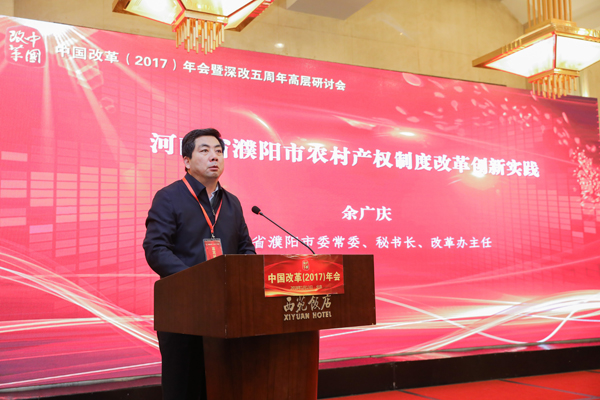 河南省濮陽市委常委、秘書長、改革辦主任余廣慶介紹了濮陽特色鮮明的農村集體產權制度改革經驗:在推進農村集體產權制度改革中,濮陽市農村黨支部成為基層黨建工作的一個重大創(chuàng)新,市委領導親自上陣親自督辦、跟蹤進度;建成了比較完善的市縣鄉(xiāng)三級產權交易平臺,充分釋放農村要素活力;依托市縣兩級黨校邀請專家解讀改革政策改革事件推動農村改革。