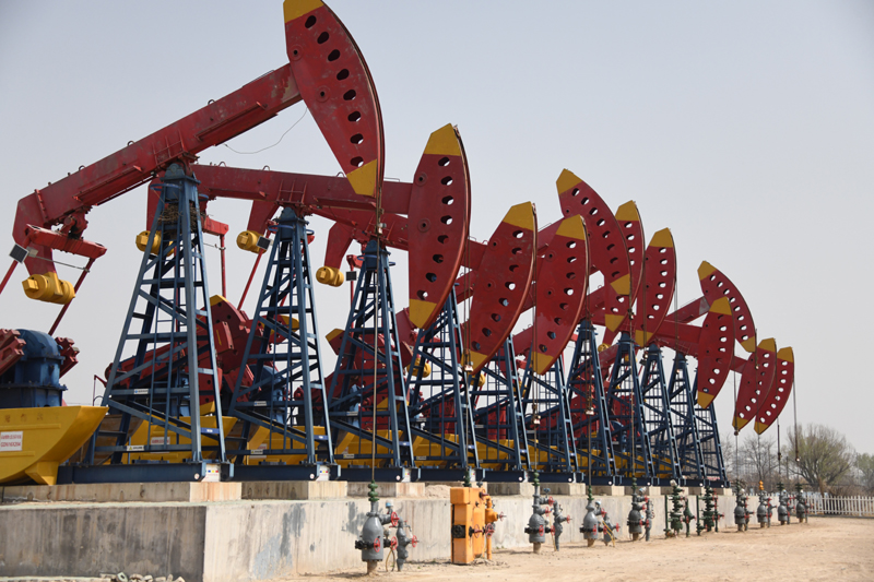 2021年3月31日,勝利油田孤島采油廠的一排抽油機在作業(yè)。新華社記者 張武岳 攝