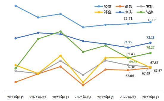 1、從領(lǐng)域來看,社會領(lǐng)域降幅略高于其他領(lǐng)域。第三季度,經(jīng)濟(jì)領(lǐng)域76.03,政治領(lǐng)域67.49 ,文化領(lǐng)域67.67,社會領(lǐng)域67.57,生態(tài)領(lǐng)域72.18,黨建領(lǐng)域70.27。與上一季度相比,經(jīng)濟(jì)、政治、生態(tài)、黨建領(lǐng)域上升,文化、社會領(lǐng)域下降。