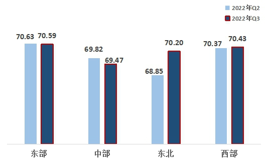 2、從區(qū)域來看,東北、西部地區(qū)均超越中部地區(qū)。東部、西部、東北、中部指數(shù)分別為70.59、70.43、70.20、69.47。區(qū)域熱度指數(shù)呈適當(dāng)?shù)牡赜蛱卣?,東部地區(qū)第一,西部地區(qū)第二,東北地區(qū)超越中部地區(qū)名列第三,中部地區(qū)最后。東北地區(qū)指數(shù)增幅較大,西部地區(qū)有所增長,東部、中部地區(qū)小幅下滑。