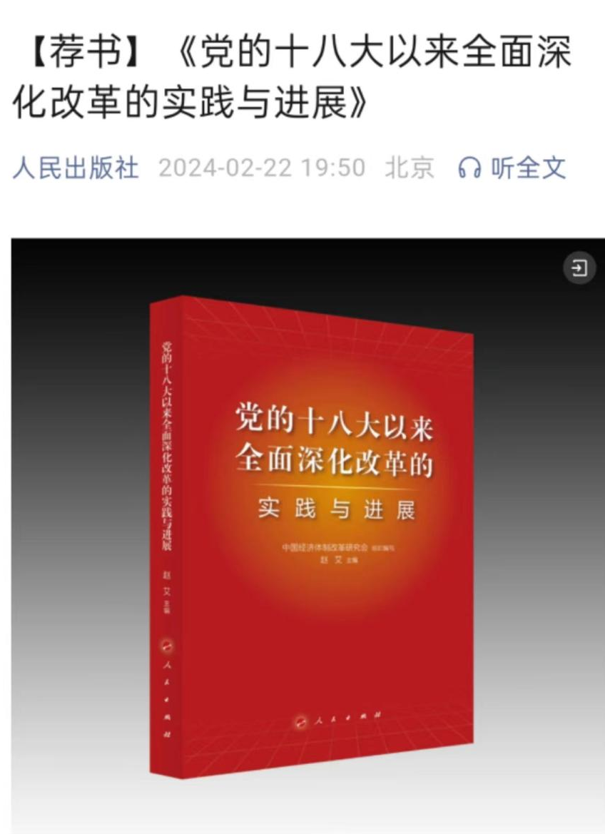 2024年2月22日,由我會組織編寫,會長彭森作序、常務(wù)副會長兼秘書長趙艾主編的《黨的十八大以來全面深化改革的實(shí)踐與進(jìn)展》一書,入選人民出版社官方微信公眾號[薦書]欄目,成為人民出版社推薦的新書。