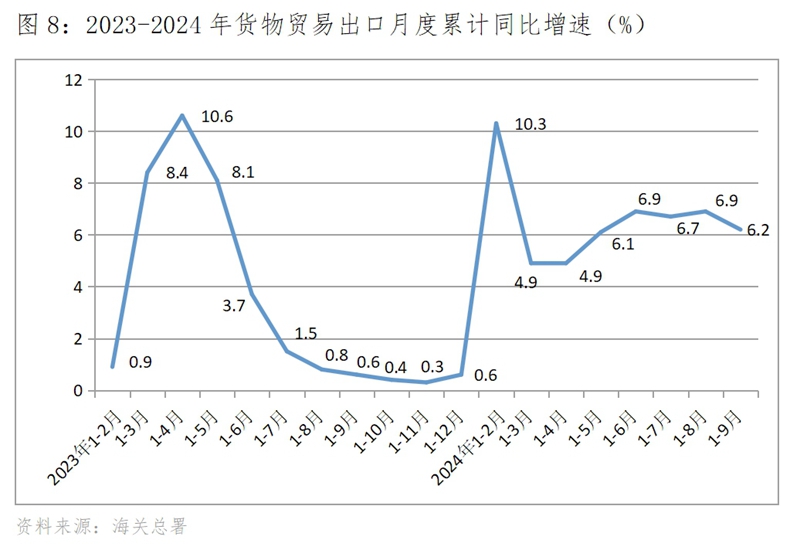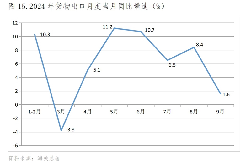 (五)出口增速在較大波動(dòng)中出現(xiàn)放緩,9月份回落。今年以來(lái)的出口增速波動(dòng)還不小,1-2月份出口同比增長(zhǎng)10.3%,3月份下降3.8%,隨后保持了兩個(gè)月增速的回升,自6月份增速開(kāi)始波動(dòng)回落,到9月份回落到增長(zhǎng)1.6%。