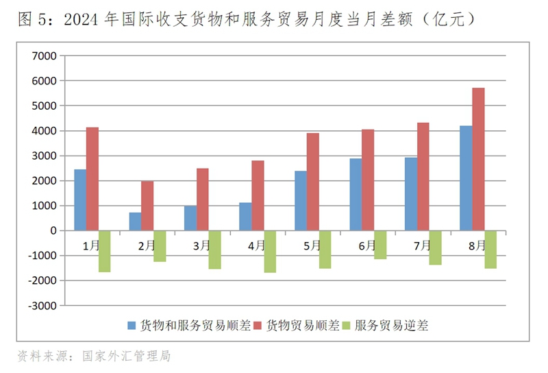(四)國(guó)際收支貨物和服務(wù)貿(mào)易順差總體逐月增加,貨物貿(mào)易順差的增加是主因。1月份,國(guó)際收支貨物和服務(wù)貿(mào)易順差實(shí)現(xiàn)了高開(kāi),達(dá)到了2459億元,2月份回落到724億元,但從2月份開(kāi)始國(guó)際收支貨物和服務(wù)貿(mào)易順差逐月增加, 8月份達(dá)4203億元,比2月份增加了3479億元。