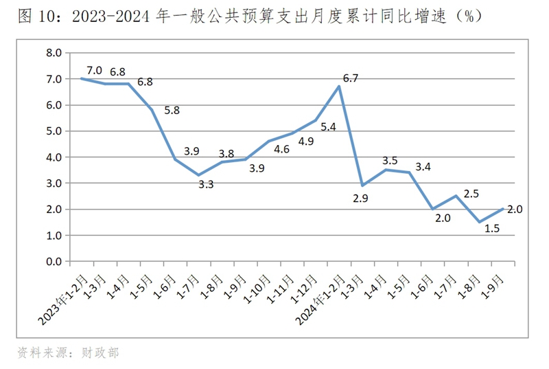 (五)財(cái)政支出增速比上年同期回落。1-9月份一般公共預(yù)算支出同比增長(zhǎng)2.0%,比上年同期增長(zhǎng)3.9%回落1.9個(gè)百分點(diǎn)。其中,支出占比較高的社會(huì)保障和就業(yè)支出同比增長(zhǎng)4.3%,教育支出增長(zhǎng)1.1%,農(nóng)林水支出增長(zhǎng)6.4%,城鄉(xiāng)社區(qū)支出增長(zhǎng)6.1%,住房保障支出增長(zhǎng)2.5%。