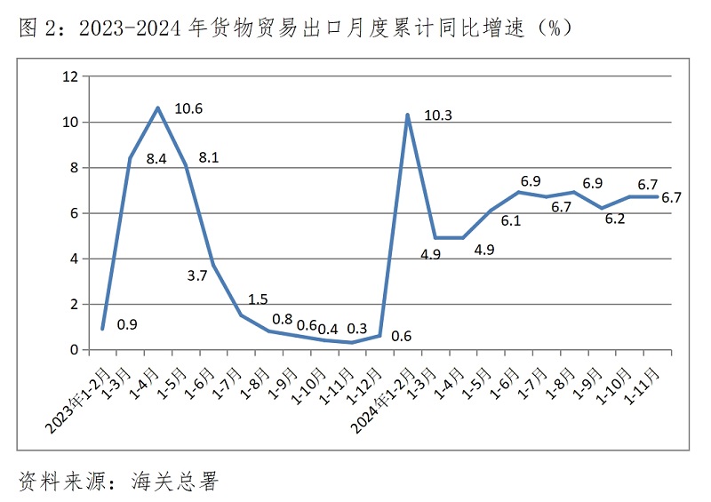 (二)貨物出口增速由升轉(zhuǎn)平。1-11月份,貨物出口同比增長6.7%,與1-10月份增速持平,1-10月份增速比1-9月份增速6.2%回升0.5個百分點。對歐盟、美國和東盟等貨物出口增速全面回升,1-11月份對歐盟出口增長3.8%,比1-10月份回升0.3個百分點;對美國出口增長5.1%,比1-10月份回升0.2個百分點;對東盟出口增長12.7%,比1-10月份回升0.2個百分點;但對拉丁美洲出口增長14.1%,比1-10月份回落0.4個百分點。