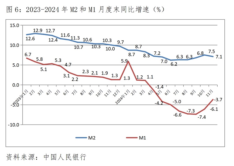 (四)M2增速由升轉(zhuǎn)落。11月末,廣義貨幣供應(yīng)量(M2)同比增長7.1%,比10月末增長7.5%回落0.4個百分點,10月末增速比9月末增速回升0.7個百分點;狹義貨幣供應(yīng)量(M1)降幅繼續(xù)縮小,11月末同比下降3.7%,比10月末同比下降6.1%縮小2.4個百分點,10月末降幅比9月末降幅縮小1.3個百分點;流通中貨幣(M0)增速由升轉(zhuǎn)落,11月末同比增長12.7%,比10月末增長12.8%回落0.1介百分點,10月末增速比9月末增速回升了1.3個百分點。各層次貨幣供應(yīng)量又出現(xiàn)了不同方向的變化走勢。
