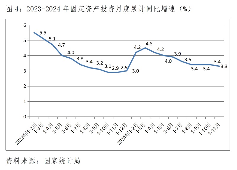 (二)投資增速由持平轉(zhuǎn)小幅回落。1-11月份,固定資產(chǎn)投資同比增長3.3%,與1-10月份增長3.4%回落0.1個百分點,1-10月份增速與1-9月份持平,投資增速在保持連續(xù)3個月持平后出現(xiàn)了小幅回落。國有控股投資增速略有回落,1-11月份比1-10月份回落0.1個百分點;民間投資降幅略有擴大,1-11月份比1-10月份擴大0.1個百分點。三次產(chǎn)業(yè)投資中,第一產(chǎn)業(yè)投資增速回落0.1個百分點,第二產(chǎn)業(yè)投資增速回落0.2個百分點,第三產(chǎn)業(yè)投資降幅擴大0.1個百分點。