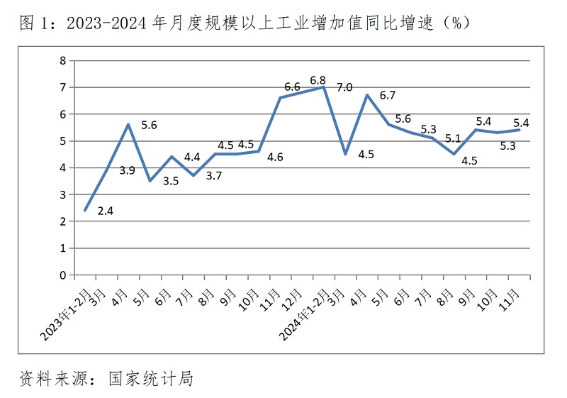 (一)工業(yè)增速由落轉(zhuǎn)升。11月份,規(guī)模以上工業(yè)增加值同比增長5.4%,比10月份增長5.3%回升了0.1個百分點,10月份增速比9月份增速5.4%回落了0.1個百分點。其中,制造業(yè)同比增長6.0%,比上月回升0.6個百分點;國有控股企業(yè)增長3.9%,回升0.1個百分點;私營企業(yè)增長4.5%,回落0.3個百分點。