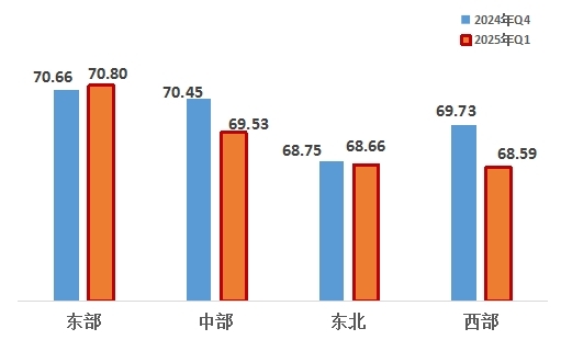 從四大區(qū)域來(lái)看,東部、中部、東北、西部地區(qū)分別為70.80、69.53、68.66、68.59,排名呈現(xiàn)明顯的地域特征,分別為東部第一,中部第二,東北第三,西部第四。連續(xù)兩個(gè)季度,東部地區(qū)名列四大區(qū)域之首且改革熱度指數(shù)提升。與上一季度相比,東北地區(qū)排名上升。