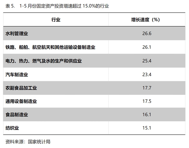 1-5月份,固定資產(chǎn)投資增速超過15%的主要行業(yè)共8個,即水利管理業(yè)增長26.6%,鐵路、船舶、航空航天和其他運輸設(shè)備制造業(yè)增長26.1%,電力、熱力、燃氣及水的生產(chǎn)和供應業(yè)增長25.4%,汽車制造業(yè)增長23.4%,農(nóng)副食品加工業(yè)增長17.7%,通用設(shè)備制造業(yè)增長17.5%,食品制造業(yè)增長16.1%,紡織業(yè)增長15.1%。