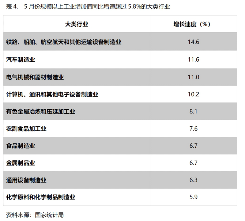 5月份,增長速度超過規(guī)模以上工業(yè)增長5.8%的主要大類行業(yè)共有10個,即鐵路、船舶、航空航天和其他運輸設(shè)備制造業(yè)增長14.6%,汽車制造業(yè)增長11.6%,電氣機械和器材制造業(yè)增長11.0%,計算機、通訊和其他電子設(shè)備制造業(yè)增長10.2%,有色金屬冶煉和壓延加工業(yè)增長8.1%,農(nóng)副食品加工業(yè)增長7.6%,食品制造業(yè)增長6.7%,金屬制品業(yè)增長6.7%,通用設(shè)備制造業(yè)增長6.3%,化學原料和化學制品制造業(yè)增長5.9%。