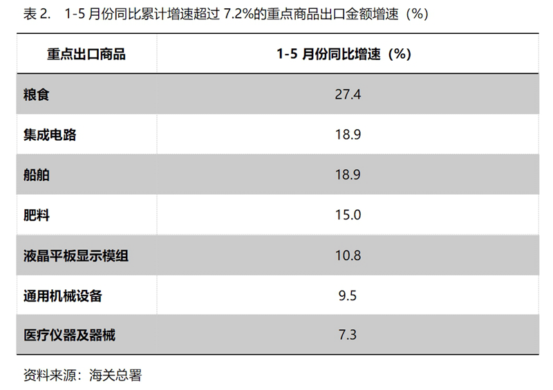 1-5月份,出口金額同比增速超過7.2%的重點商品共有7類,即糧食增長27.4%,集成電路增長18.9%,船舶增長18.9%,肥料出口增長15.0%,液晶平板顯示模組增長10.8%,通用機器設(shè)備增長9.5%,醫(yī)療儀器及器械增長7.3%。
