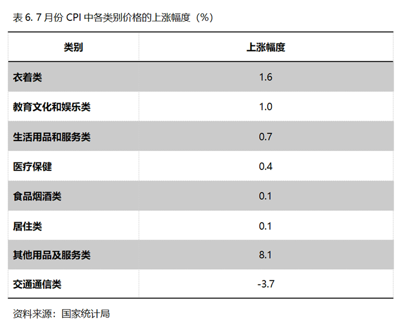 7月份,在CPI 8個(gè)類(lèi)別中有7個(gè)類(lèi)別保持上漲,1個(gè)類(lèi)別下降。上漲的7個(gè)類(lèi)別包括衣著類(lèi)價(jià)格同比上漲1.6%,教育文化和娛樂(lè)類(lèi)上漲1.0%,生活用品及服務(wù)類(lèi)上漲0.7%,醫(yī)療保健類(lèi)上漲0.4%,食品煙酒類(lèi)上漲0.1%,居住類(lèi)上漲0.1%,其他用品和服務(wù)類(lèi)上漲8.1%;下降的雖然就交通通信類(lèi)1個(gè)類(lèi)別,但降幅仍還比較大,7月份同比下降3.7%。