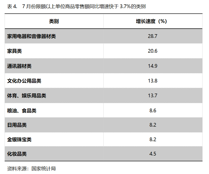7月份,限額以上單位商品零售額同比增速快于社會(huì)消費(fèi)品零售總額3.7%增速的共有9類(lèi),即家用電器和音像器材類(lèi)同比增長(zhǎng)28.7%,家具類(lèi)增長(zhǎng)20.6%,通訊器材類(lèi)增長(zhǎng)14.9%,文化辦公用品類(lèi)增長(zhǎng)13.8%,體育、娛樂(lè)用品類(lèi)增長(zhǎng)13.7%,糧油、食品類(lèi)增長(zhǎng)8.6%,日用品類(lèi)增長(zhǎng)8.2%,金銀珠寶類(lèi)增長(zhǎng)8.2%,化妝品類(lèi)增長(zhǎng)4.5%。