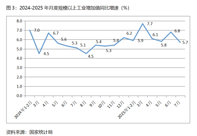 (一)工業(yè)增速由升轉(zhuǎn)落。7月份,規(guī)模以上工業(yè)增加值同比增長(zhǎng)5.7%,比上月增長(zhǎng)6.8%回落了1.1個(gè)百分點(diǎn),6月份比5月份回升了1.0個(gè)百分點(diǎn)。從工業(yè)三大門(mén)類(lèi)看,采礦業(yè)和制造業(yè)增速比上月回落,電力、熱力、燃?xì)饧八a(chǎn)和供應(yīng)業(yè)增速回升,7月份采礦業(yè)同比增長(zhǎng)5.0%,比上月回落1.1個(gè)百分點(diǎn);制造業(yè)增長(zhǎng)6.2%,比上月回落1.2個(gè)百分點(diǎn);電力、熱力、燃?xì)饧八a(chǎn)和供應(yīng)業(yè)增長(zhǎng)3.3%,比上月回升1.5個(gè)百分點(diǎn)。今年以來(lái)工業(yè)增速波動(dòng)的運(yùn)行,反映出工業(yè)的回升仍缺乏穩(wěn)固的基礎(chǔ)。