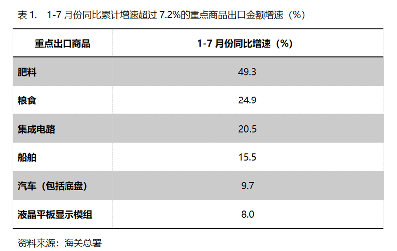 1-7月份,出口金額同比增速超過(guò)7.3%的重點(diǎn)商品共有6類(lèi),即肥料出口增長(zhǎng)49.3%,糧食增長(zhǎng)24.9%,集成電路增長(zhǎng)20.5%,船舶增長(zhǎng)15.5%,汽車(chē)(包括底盤(pán))增長(zhǎng)9.7%,液晶平板顯示模組增長(zhǎng)8.0%。