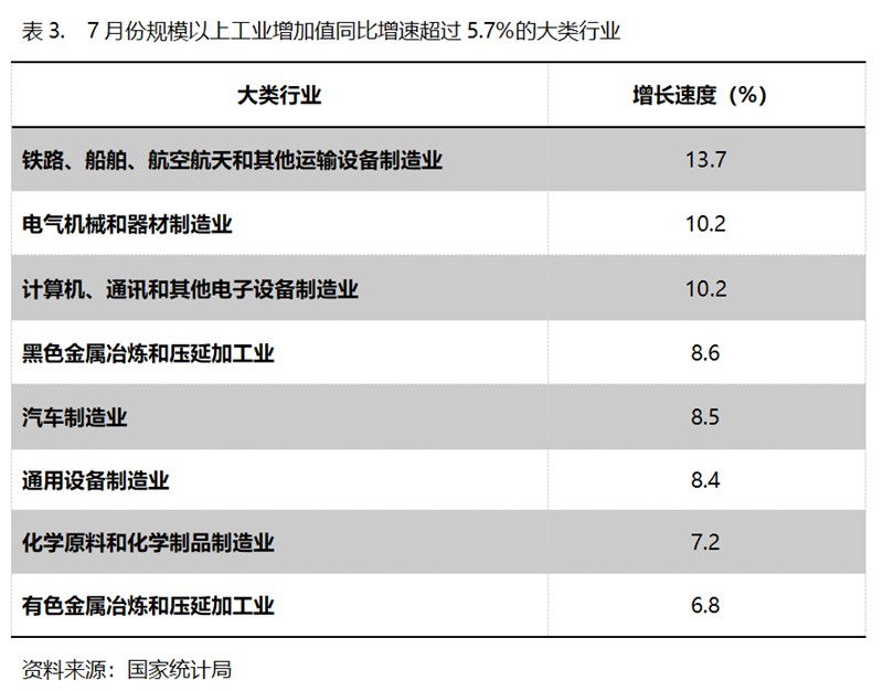 7月份,增長(zhǎng)速度超過(guò)規(guī)模以上工業(yè)增長(zhǎng)5.7%的主要大類(lèi)行業(yè)共有8個(gè),即鐵路、船舶、航空航天和其他運(yùn)輸設(shè)備制造業(yè)同比增長(zhǎng)13.7%,電氣機(jī)械和器材制造業(yè)增長(zhǎng)10.2%,計(jì)算機(jī)、通訊和其他電子設(shè)備制造業(yè)增長(zhǎng)10.2%,黑色金屬冶煉和壓延加工業(yè)增長(zhǎng)8.6%,汽車(chē)制造業(yè)增長(zhǎng)8.5%,通用設(shè)備制造業(yè)增長(zhǎng)8.4%,化學(xué)原料和化學(xué)制品制造業(yè)增長(zhǎng)7.2%,有色金屬冶煉和壓延加工業(yè)增長(zhǎng)6.8%。